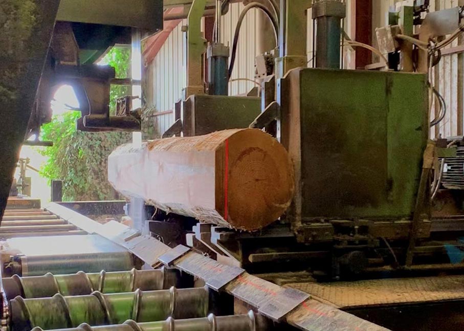 Les billons sont ensuite livrés à la scierie pour être sciés en planches, avant le séchage. A noter qu'aucun produit de traitement n'est utilisé sur notre site pour la fabrication de nos parquets, lambris ou moulures.